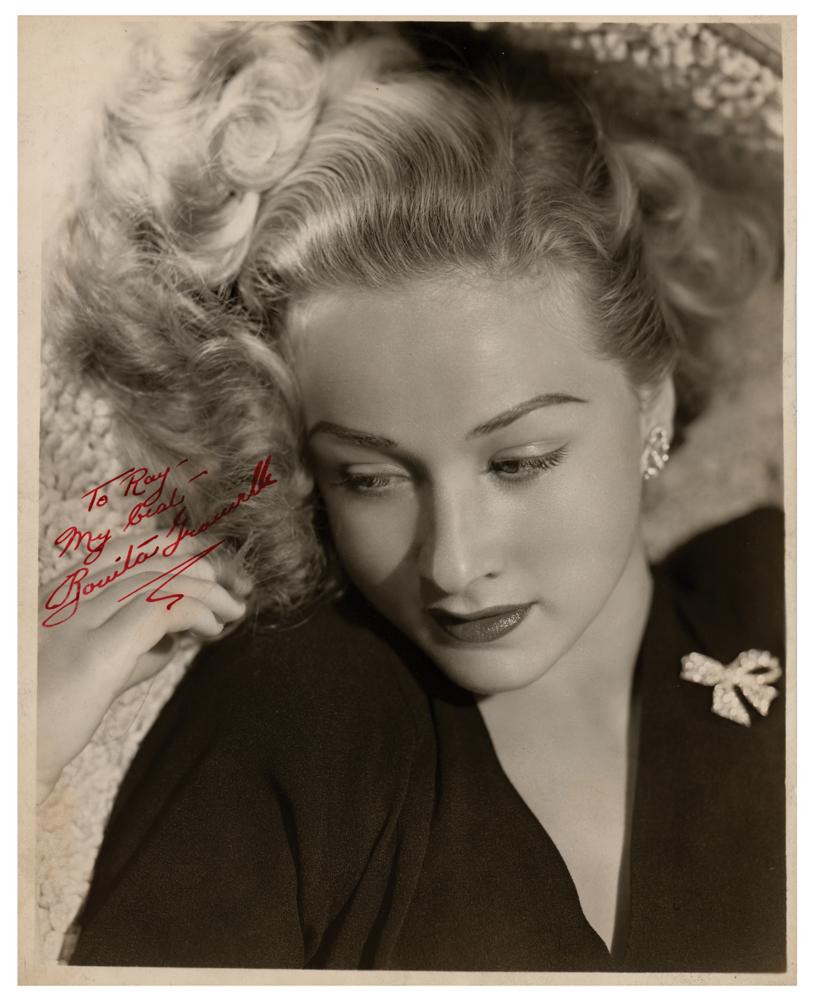 American actress and producer (1923 -1988) who is perhaps best known for her title role in the Nancy Drew film series, and for her Oscar nomination at the age of 14 in These Three. Vintage pearl-finish 7.5 x 9.5 photo of Granville in a lovely reclined pose, signed and inscribed in red fountain pen, "To Ray—My best—Bonita Granville.” In fine condition, with trimmed borders.