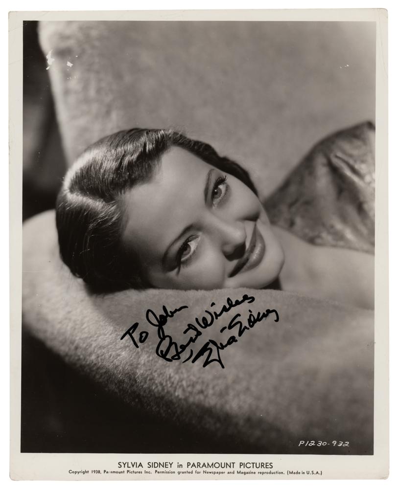 American actress (1910-1999) whose career spanned over 70 years and who was nominated for the Academy Award for Best Supporting Actress for her performance in Summer Wishes, Winter Dreams. She later gained attention for her role as Juno, a case worker in the afterlife, in Tim Burton's 1988 film Beetlejuice. Glossy 8 x 10 Paramount Pictures publicity photo of Sidney during a restful moment, signed and inscribed in black felt tip, "To John, Best wishes, Sylvia Sidney.” In very good to fine condition, with scattered light creasing, and flecks of emulsion loss to the upper left.