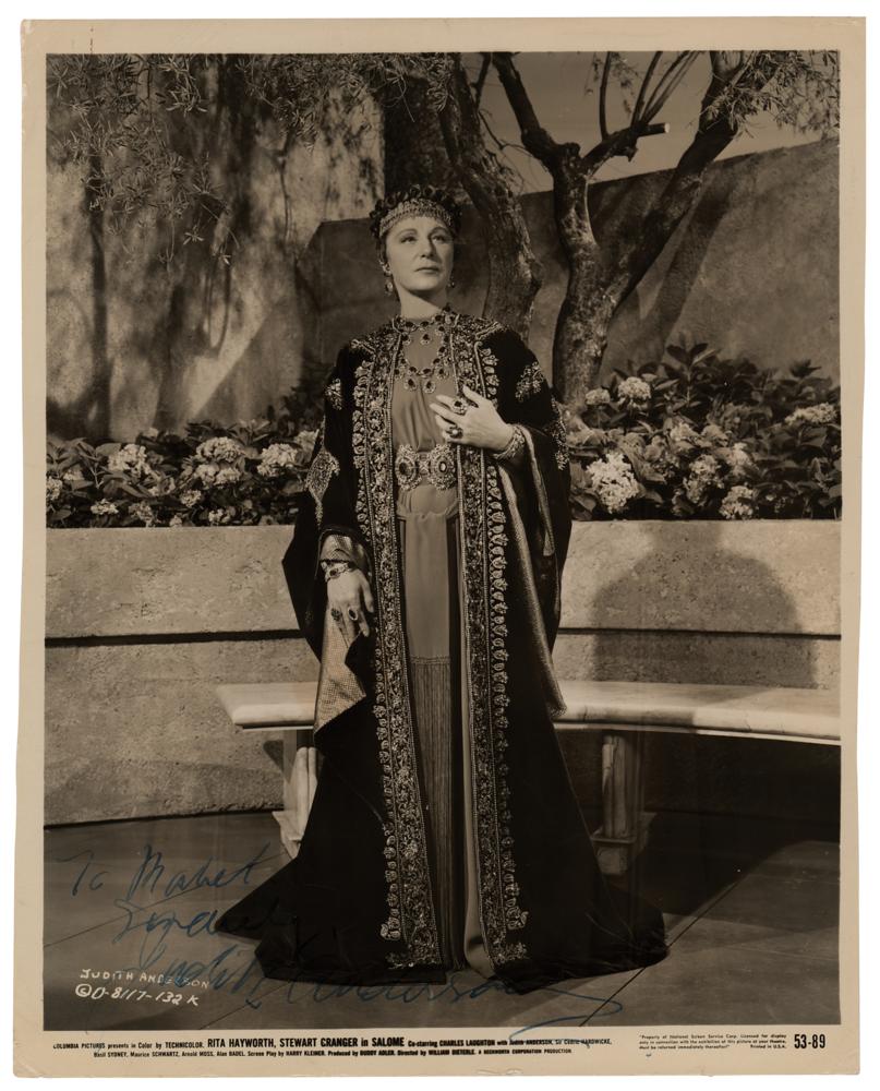 Australian actress (1897-1992) who had a successful career in stage, film and television. A pre-eminent stage actress in her era, she won two Emmy Awards and a Tony Award and was also nominated for a Grammy Award and an Academy Award. She is considered one of the 20th century's greatest classical stage actors. Vintage glossy 8 x 10 Columbia Pictures publicity photo of Judith Anderson as Queen Herodias in the 1953 film Salome, signed and inscribed in fountain pen, "To Mabel, Sincerely, Judith Anderson.” In fine condition, with scattered small creases.