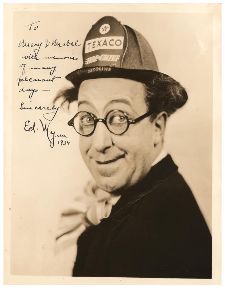Vintage glossy 8 x 10.25 photo of Wynn wearing a too-small Texaco Fire Chief hat, signed and inscribed in fountain pen, "To Mary & Mabel, with memories of many pleasant days—Sincerely, Ed Wynn, 1934.” In fine condition.