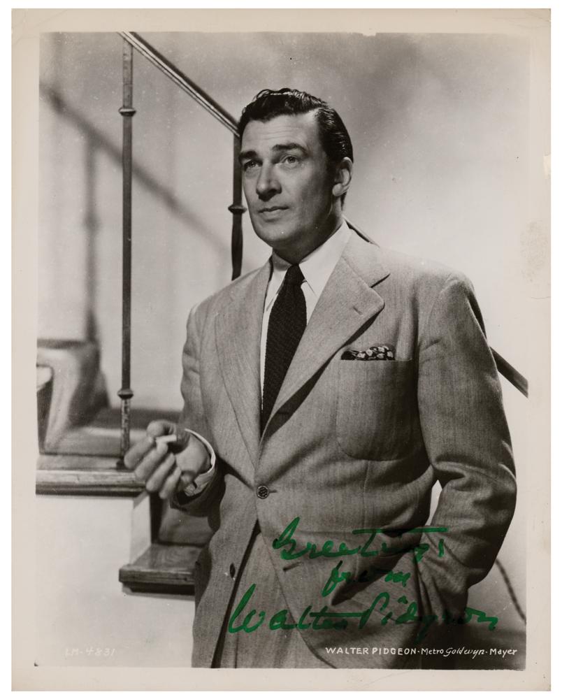 Canadian actor (1897-1984) who starred in many films, including How Green Was My Valley, Mrs. Miniver, The Bad and the Beautiful, and Forbidden Planet. Glossy 8 x 10.25 half-length photo of the MGM studio actor holding a cigarette, signed in green felt tip, “Greetings from, Walter Pidgeon.” In very good to fine condition, with scattered light creasing, and a short tear to the right border.