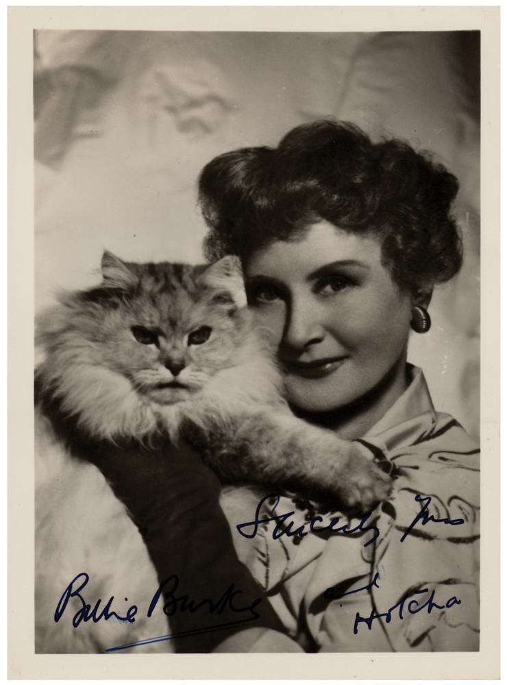 American actress (1884-1970) who is best known as Glinda the Good Witch of the North in The Wizard of Oz. She was nominated for the Academy Award for Best Supporting Actress for her performance as Emily Kilbourne in Merrily We Live. Vintage matte-finish 5 x 6.75 photo of Burke posing with her cat, signed in bold fountain pen, “Sincerely yours, Billie Burke and Hotcha.” In very good to fine condition, with a crease touching her hair and left cheek.
