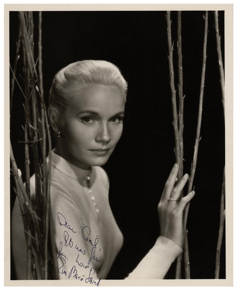 American actress of film, theatre and television (born 1924) who won the Academy Award for Best Supporting Actress for her role in On the Waterfront; she is ​​both the oldest living and earliest surviving Academy Award winner and one of the last surviving stars from the Golden Age of Hollywood cinema. Vintage matte-finish 8 x 10 photo of the lovely actress posing between branches, signed and inscribed in fountain pen, “Dear Cal, It was for fun, love, Eva Marie Saint.” In very fine condition.
