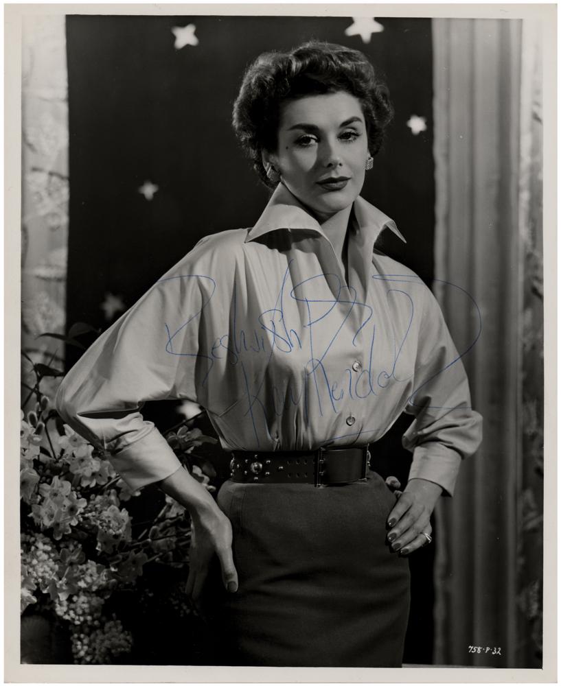 English comedienne and actress (born 1927) who won a Golden Globe Award for Best Actress for her role in the musical-comedy film Les Girls; she died from leukemia at age 33 in 1959. Vintage glossy 8 x 10 three-quarter-length photo of Kendall with her hands on her hips, signed in blue ballpoint, "Best wishes, Kay Kendall." In fine condition, with some scattered light creasing.