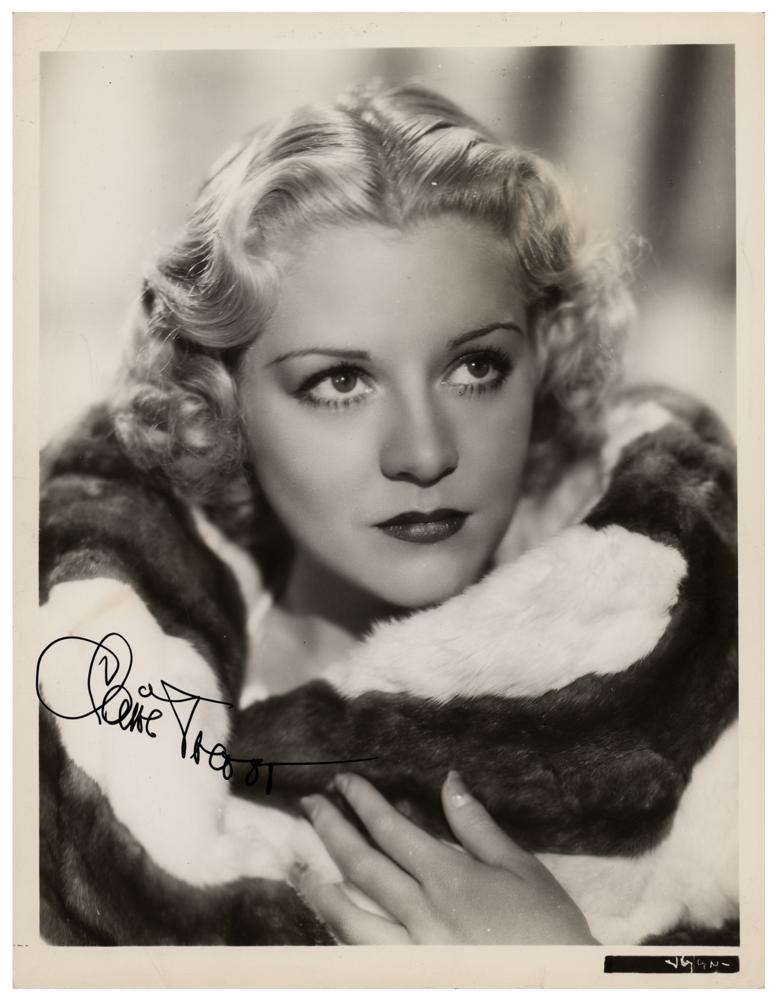Glossy 8 x 10 close-up photo of Claire Trevor wrapped in fur, signed in black felt tip. In very good to fine condition, with a few small creases, and scattered surface marks.
