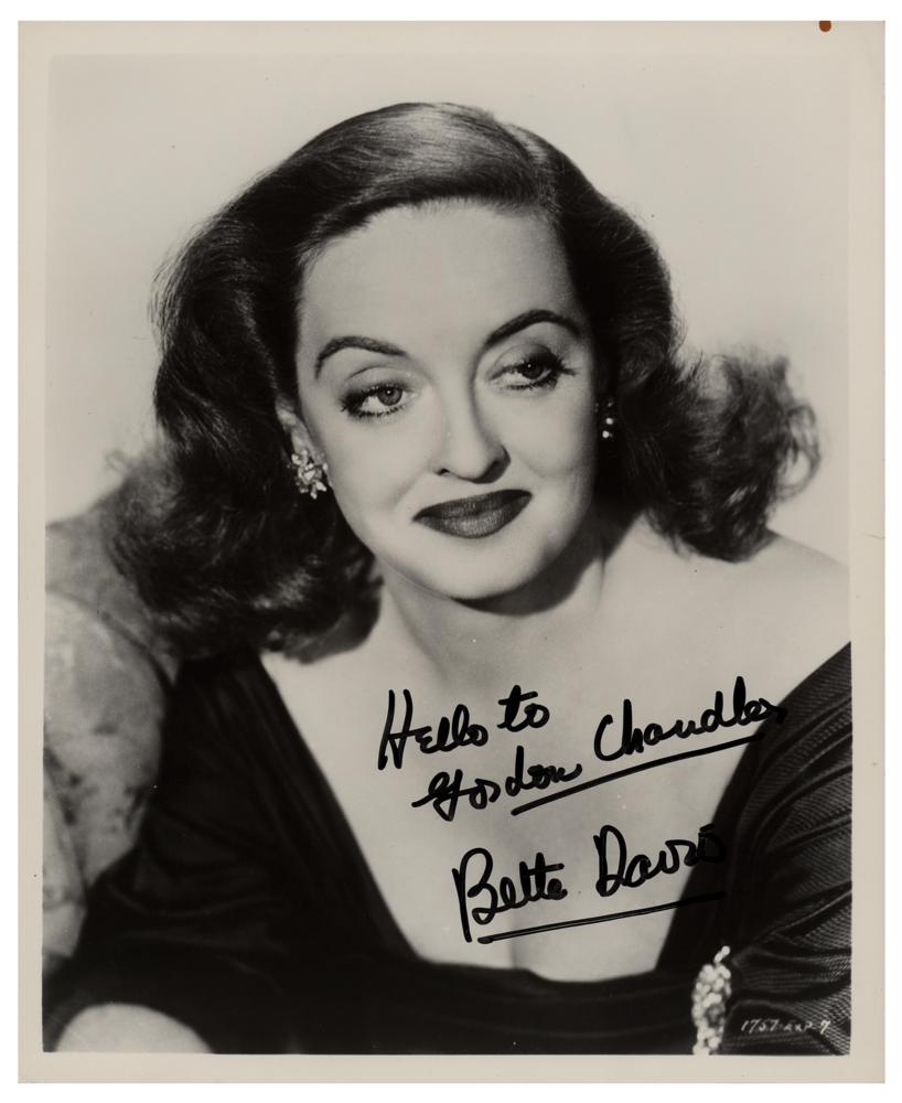Glossy 8 x 9.75 head-and-shoulders photo of the Oscar-winning actress, signed and inscribed in black felt tip, “Hello to Gordon Chandler, Bette Davis.” In fine condition, with a small stain to the upper right corner and small tear to the right edge.