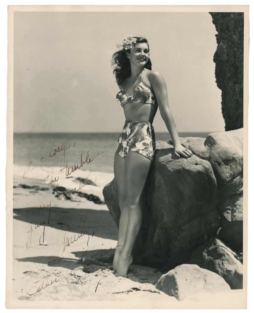 Vintage matte-finish 8 x 10 full-length photo of a beautiful Williams relaxing on the beach in a swimsuit, signed and inscribed in fountain pen to assistant director George Rhein, "To George, the terrible—a very lovable guy—Sincerely, Esther Williams." In fine condition, with lightly trimmed borders, and fading to the signature and parts of the inscription.