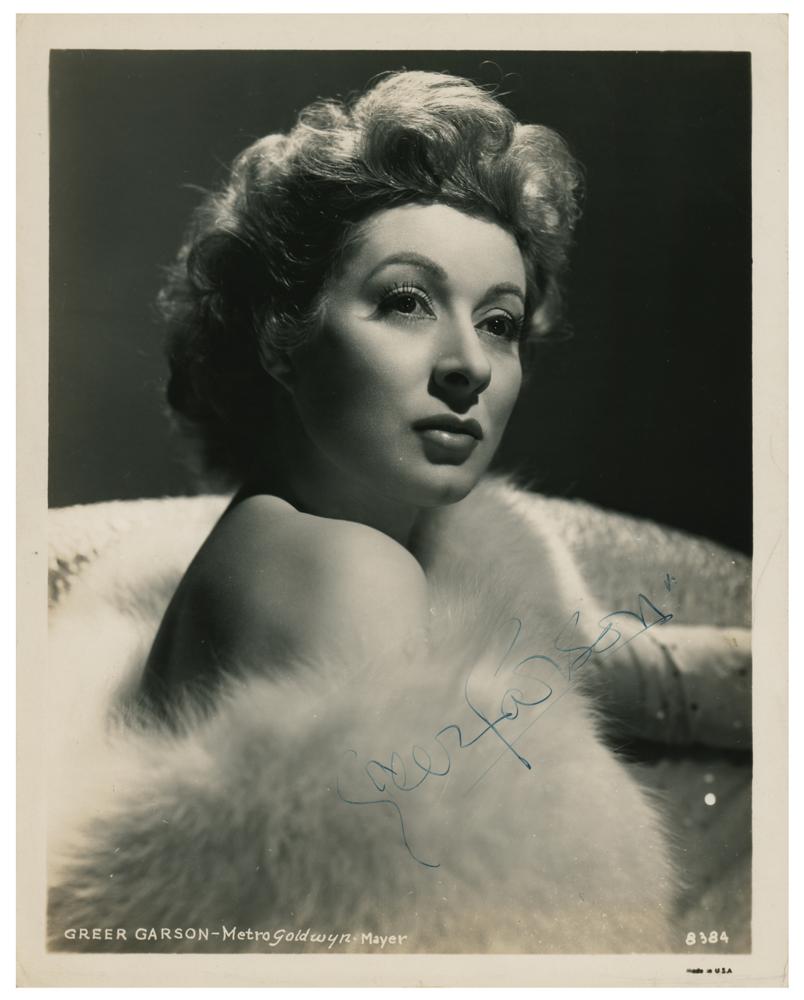 Attractive vintage glossy 8 x 10 MGM publicity photo of the bare-shouldered Garson in a fur shawl, signed in fountain pen. In fine condition.