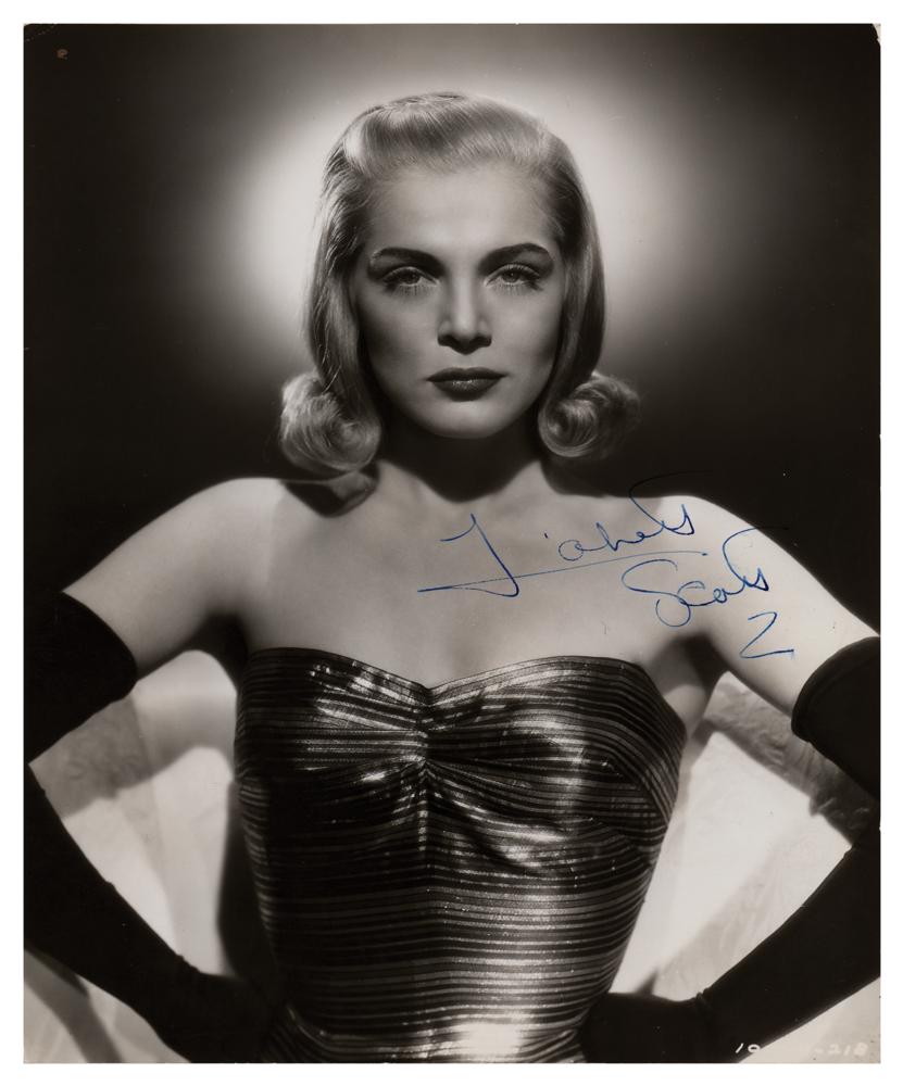 Stunning vintage glossy 7.5 x 9 portrait of Lizabeth Scott for the 1947 film noir I Walk Alone, signed in fountain pen. Reverse bears a Bud Fraker credit stamp. In fine condition, with trimmed edges.