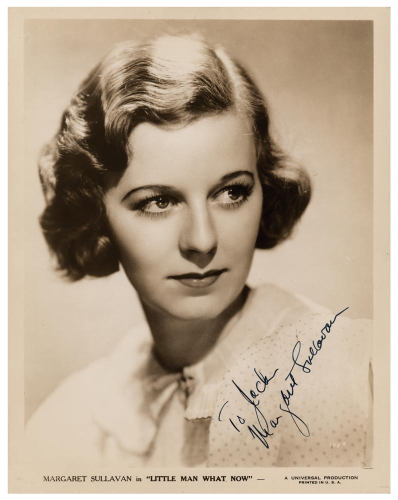 Vintage glossy 8 x 10 photo of Sullavan as Emma 'Lämmchen' Pinneberg in the 1934 tearjerker Little Man, What Now?, boldly signed and inscribed in fountain pen, "To Jack, Margaret Sullavan.” In fine condition, with scattered small creases, a few of which touch her face.