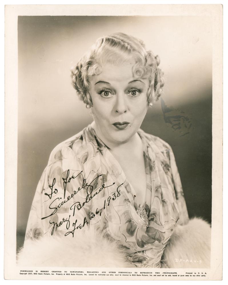 Vintage glossy 8 x 10 RKO publicity photo of the actress with a surprised look on her face, signed and inscribed in fountain pen, "To Joe, Sincerely, Mary Boland, Feb. 26, 1938.” In very good to fine condition, with small surface scratches, faint surface impressions from a notation on the back, and scattered areas of emulsion irregularity.