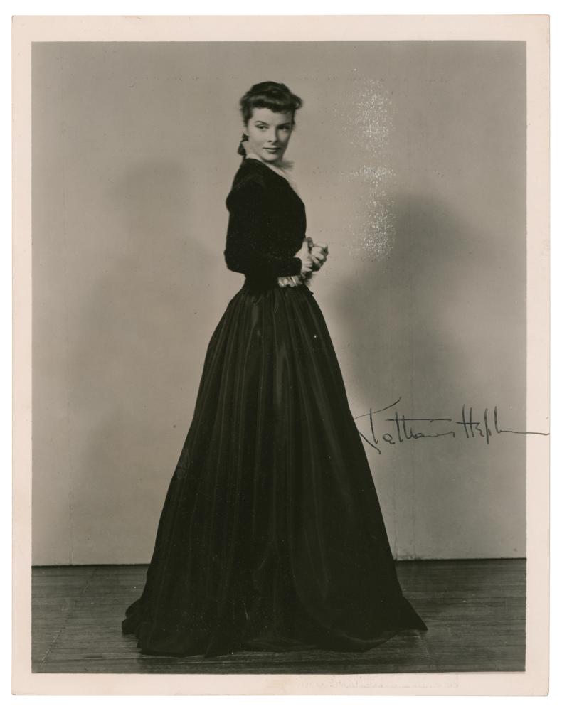 Vintage glossy 8 x 10 full-length photo of Hepburn in a long black dress, nicely signed in fountain pen. In very good to fine condition, with an area of scuffing to the background.