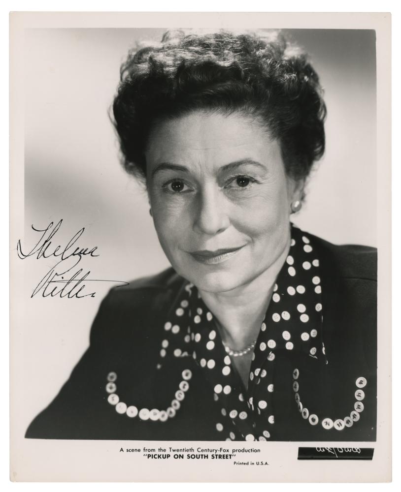 Vintage glossy 8 x 10 photo of Thelma Ritter as Moe in 20th Century-Fox's 1935 Cold War noir thriller Pickup on South Street, signed in fountain pen. In fine condition, with a small surface impression touching her right cheek. Ritter received an Academy Award nomination for Best Actress in a Supporting Role for the part.