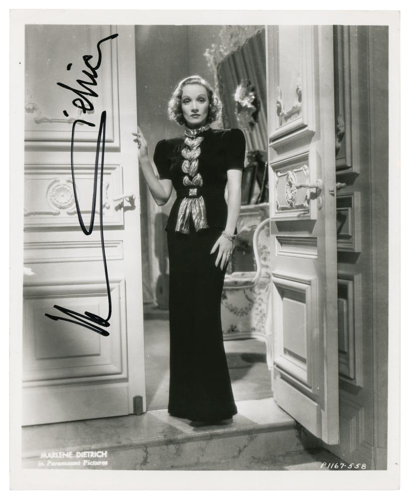 Glossy 8 x 10 full-length photo of Dietrich in one of her acclaimed Paramount roles, signed vertically in black felt tip. In fine condition.