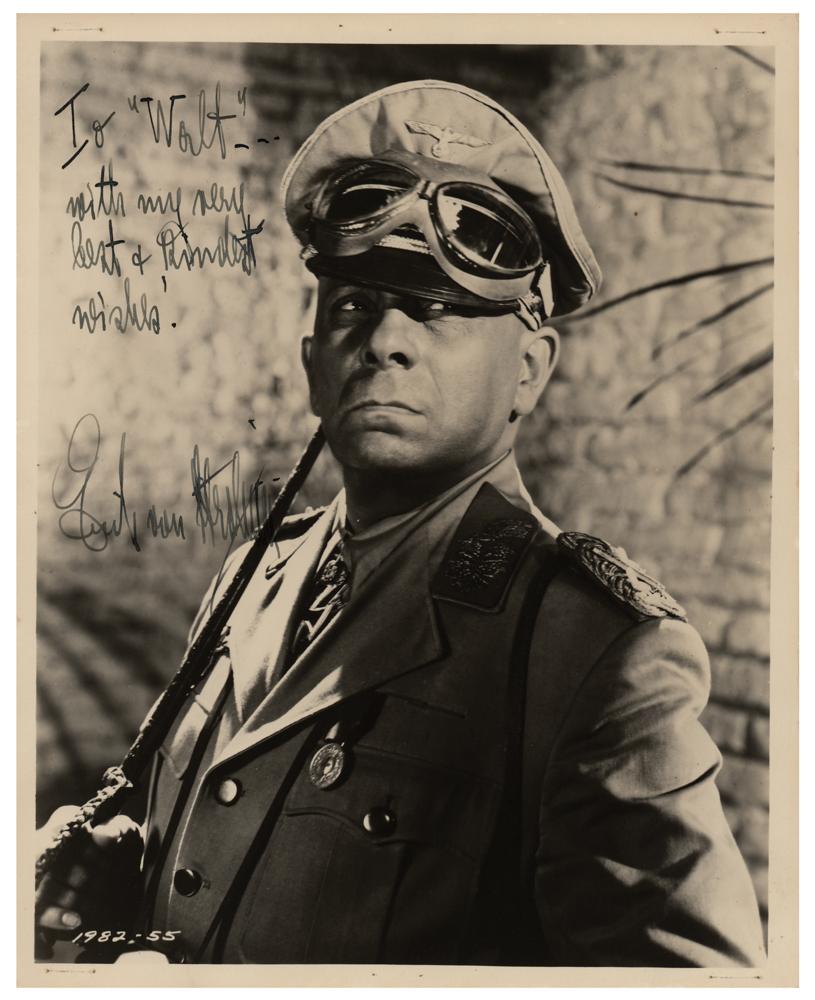 Vintage matte-finish 8 x 10 photo of Stroheim as Field Marshal Erwin Rommel in the 1943 war film Five Graves to Cairo, signed and inscribed in fountain pen, "To 'Walt,' with my very best & kindest wishes, Erich von Stroheim.” In very fine condition, with staple holes in the borders.