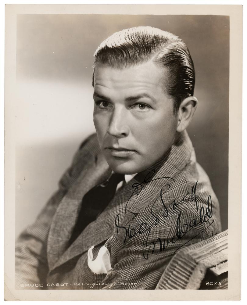 Actor (1904-1972) best remembered as Fay Wray's savior in King Kong. Sharp vintage glossy 8 x 10 MGM photo of the actor with slicked-back hair, signed and inscribed in fountain pen, "To Joe, Good Luck, Bruce Cabot.” In fine condition.