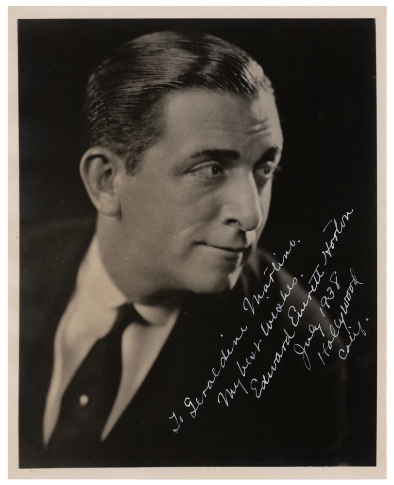 Vintage matte-finish 7.75 x 9.75 portrait of the prolific character actor, signed and inscribed in white ink, "To Geraldine Martino, My best wishes, Edward Everett Horton, July 1938, Hollywood, Calif.” In very fine condition, with faint silvering to the side edges.