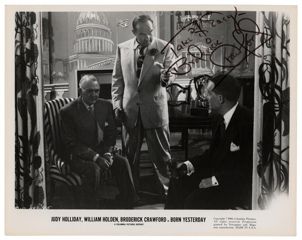 Glossy 10 x 8 Columbia Pictures promo photo for the 1950 comedy-drama Born Yesterday, signed in black felt tip, "Take It Easy—Broderick Crawford." In fine condition.