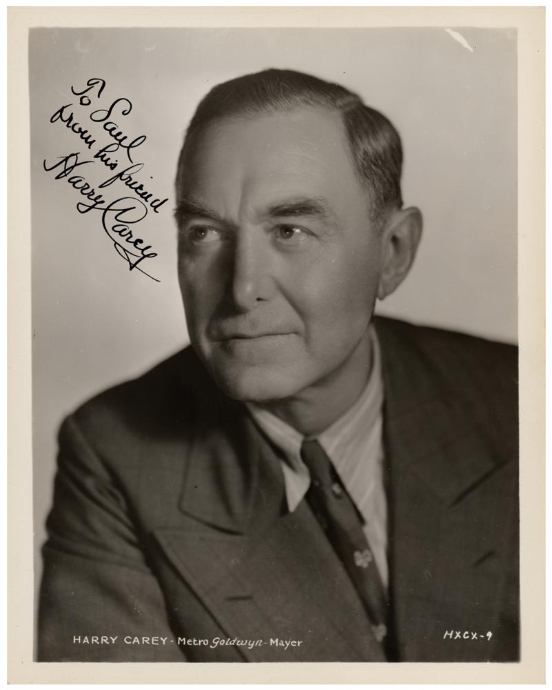 Early western film star (1878-1947) who earned an Oscar nomination for his supporting role in Mr. Smith Goes to Washington. Vintage glossy 8 x 10 MGM publicity portrait, boldly signed and inscribed in fountain pen, "To Saul, from his friend, Harry Carey.” Reverse is stamp-dated October 25, 1941. In fine condition.
