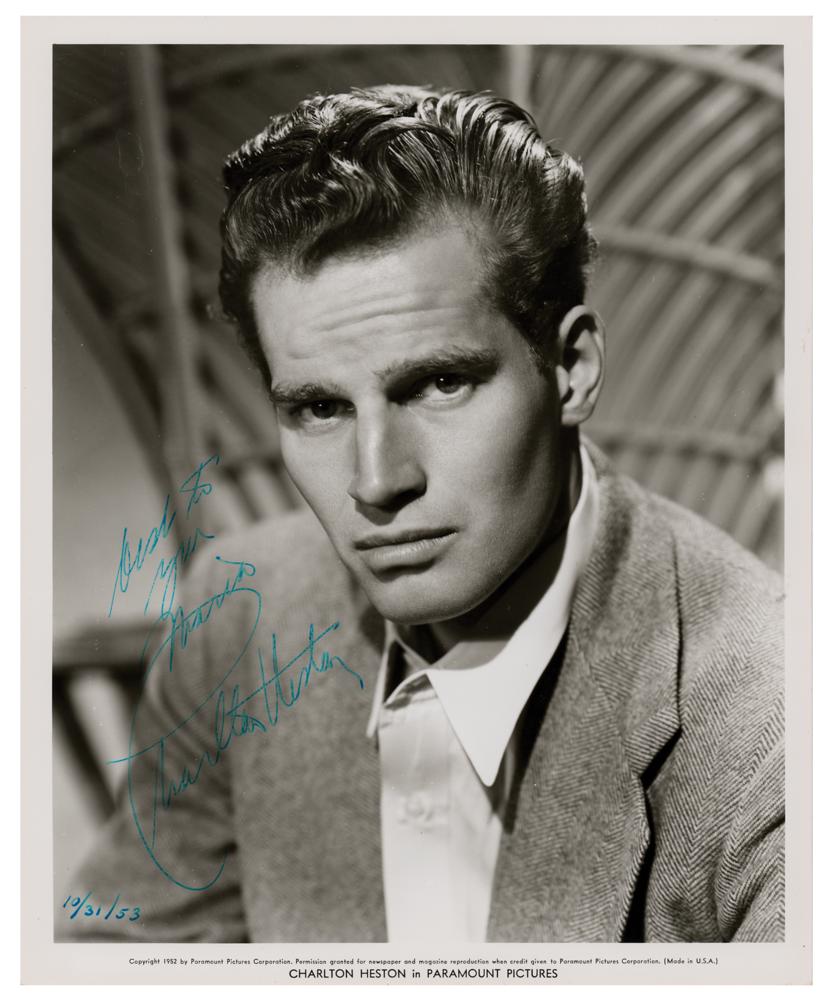 Handsome vintage glossy 8 x 10 Paramount Pictures publicity photo of the influential leading man, signed and inscribed in fountain pen, "Best to you Maria, Charlton Heston.” Dated October 31, 1953, in another hand. In fine condition.