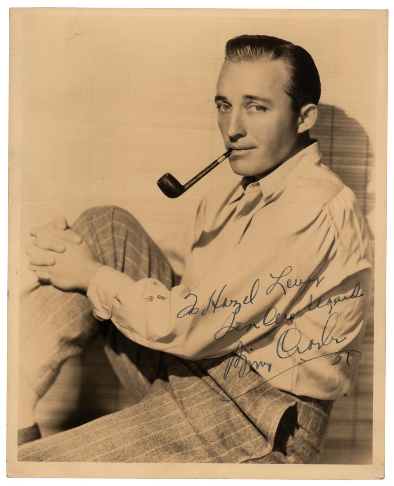 Vintage sepia matte-finish 8 x 10 photo of Crosby smoking a pipe, signed and inscribed in fountain pen, "To Hazel Lewis, Sincere regards, Bing Crosby.” In fine condition.