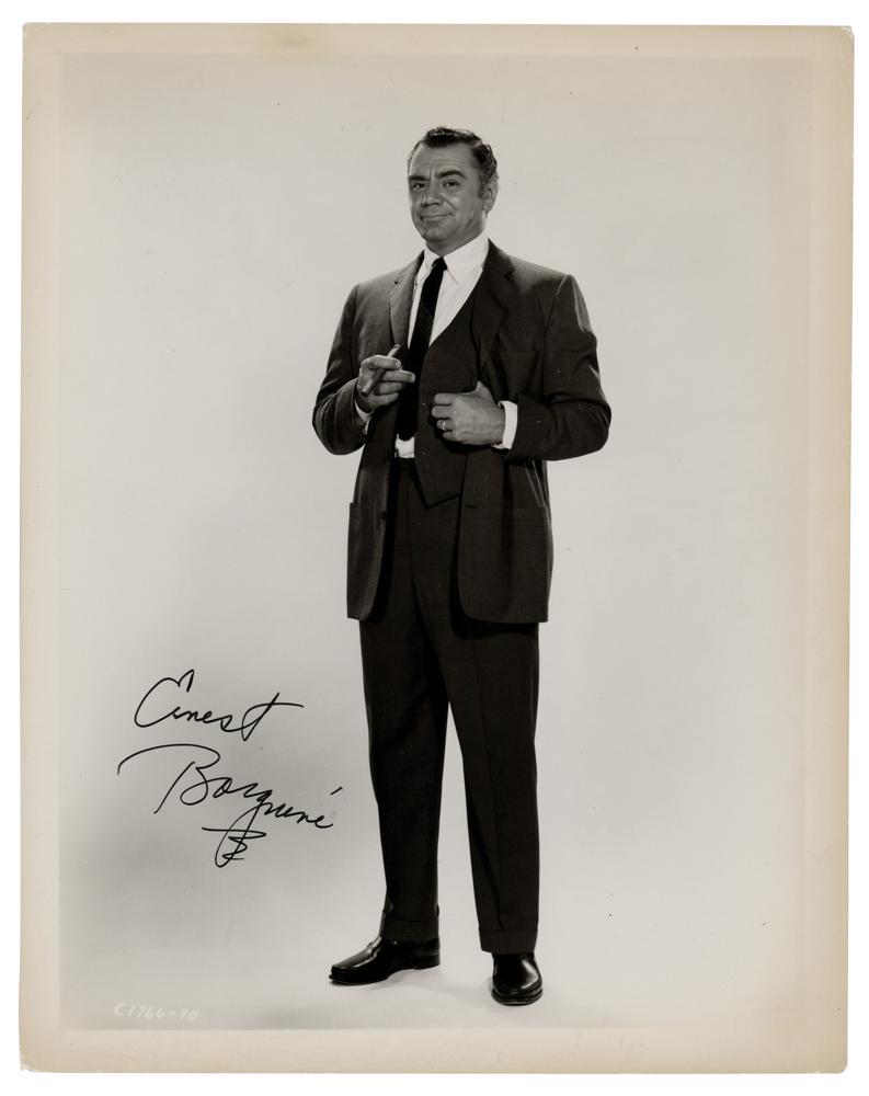 Glossy 8 x 10 full-length photo of Ernest Borgnine with a cigar in hand, signed in black felt tip. In fine condition.