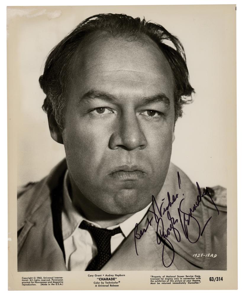 Glossy 8 x 10 Universal Pictures promo photo of Kennedy as Herman Scobie in Alfred Hitchcock's 1963 classic Charade, signed in black felt tip, "Best Wishes! George Kennedy." In very good to fine condition, with emulsion loss to the upper left corner.