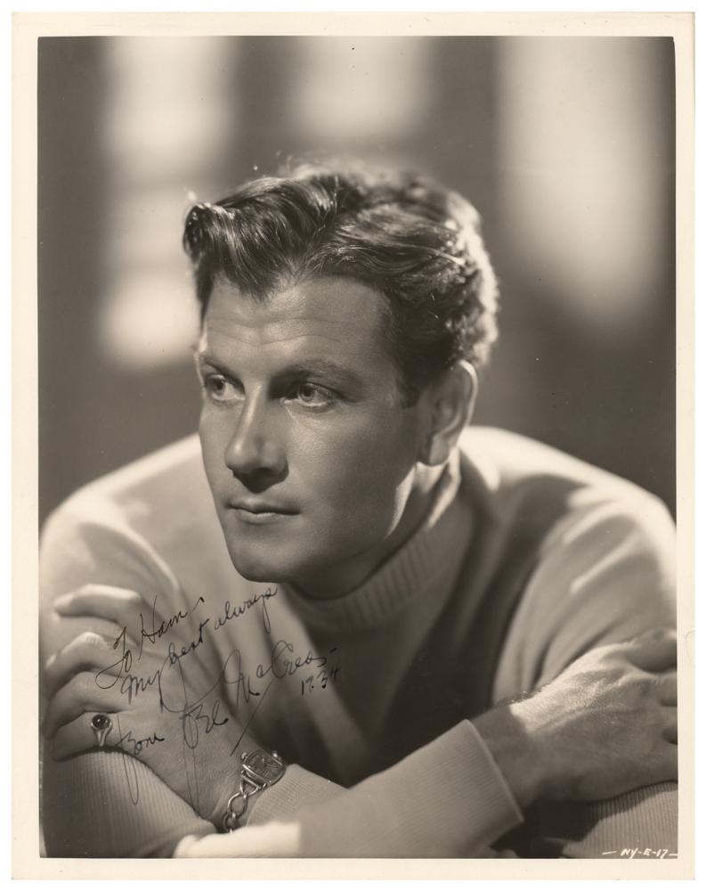 Vintage glossy 8 x 10 portrait of the popular actor with his arms crossed, signed and inscribed in fountain pen, "To Ham, My best always, from Joel McCrea, 1937.” Reverse bears an Ernest A. Bachrach/RKO credit stamp and affixed caption. In fine condition, with some light creasing touching his face.