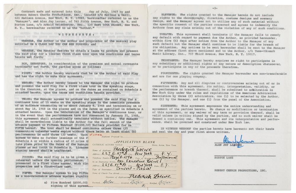 Three items signed by Broadway composers, including: a four-page agreement for a live TV presentation of the George Gershwin musical Oh Kay on NBC in 1951, signed in ink by collaborators P. G. Wodehouse and Ira Gershwin (twice, once for the "Estate of Rose Gershwin"), as well as Arthur Gershwin and producer Bernard L. Schubert; a three-page contract between Robert Cherin Productions and Alan Jay Lerner to take his "musical play entitled On A Clear Day You Can See Forever" on a 15-week tour in 1967, signed at the conclusion in felt tip by Lerner; and an application card for membership in the Catholic Actors Guild, May 27, 1942, filled out in the hand of Frederick Loewe and signed by him at the conclusion. In overall fine condition.