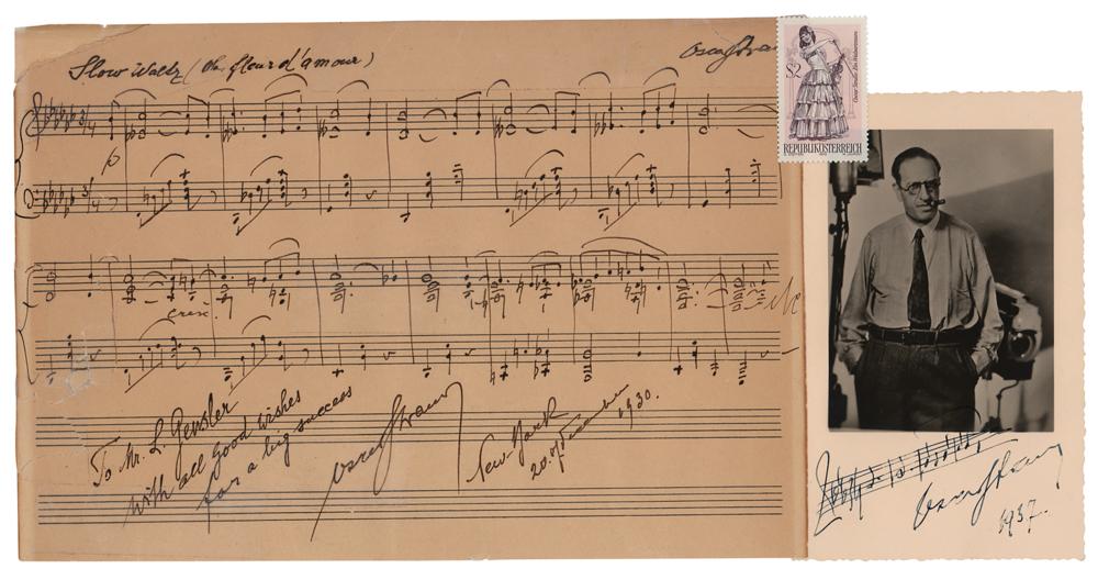 Two signed items: an AMQS on an off-white 9 x 6 musically lined sheet, featuring 16 bars on double staves from "La Fleur d'Amour," signed and inscribed in the lower border, "To Mr. L. Gensler, With all good wishes for a big success, Oscar Straus, New-York, 20 of December 1930," and signed in the upper right, "Oscar Straus"; and a 3.25 x 5.25 postcard photo of Strauss, featuring a three-bar autograph musical quotation from 'My Hero' from the operetta 'Chocolate Soldier,' signed by the composer, "Oscar Straus, 1937." In very good to fine condition, with several old repairs to tears and paper loss on the musical quotation. Accompanied by a 1970 Austrian postage stamp.