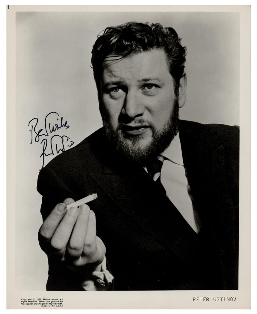 Glossy 8 x 10 United Artists publicity photo of the bearded actor holding a cigarette, signed in black felt tip, "Best Wishes, Peter Ustinov." In fine condition.