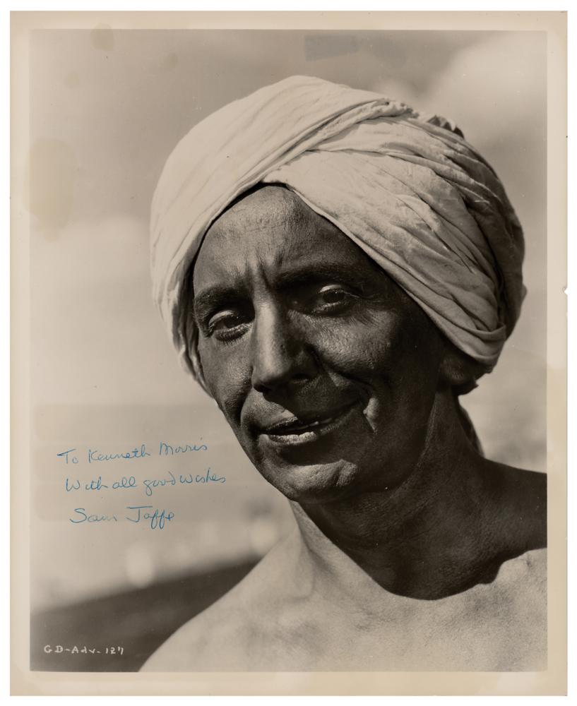 Glossy 8 x 10 photo of Jaffe in costume as Gunga Din, signed and inscribed in blue ballpoint, "To Kenneth Morris, With all good wishes, Sam Jaffe.” In very good to fine condition, with scattered light creasing.
