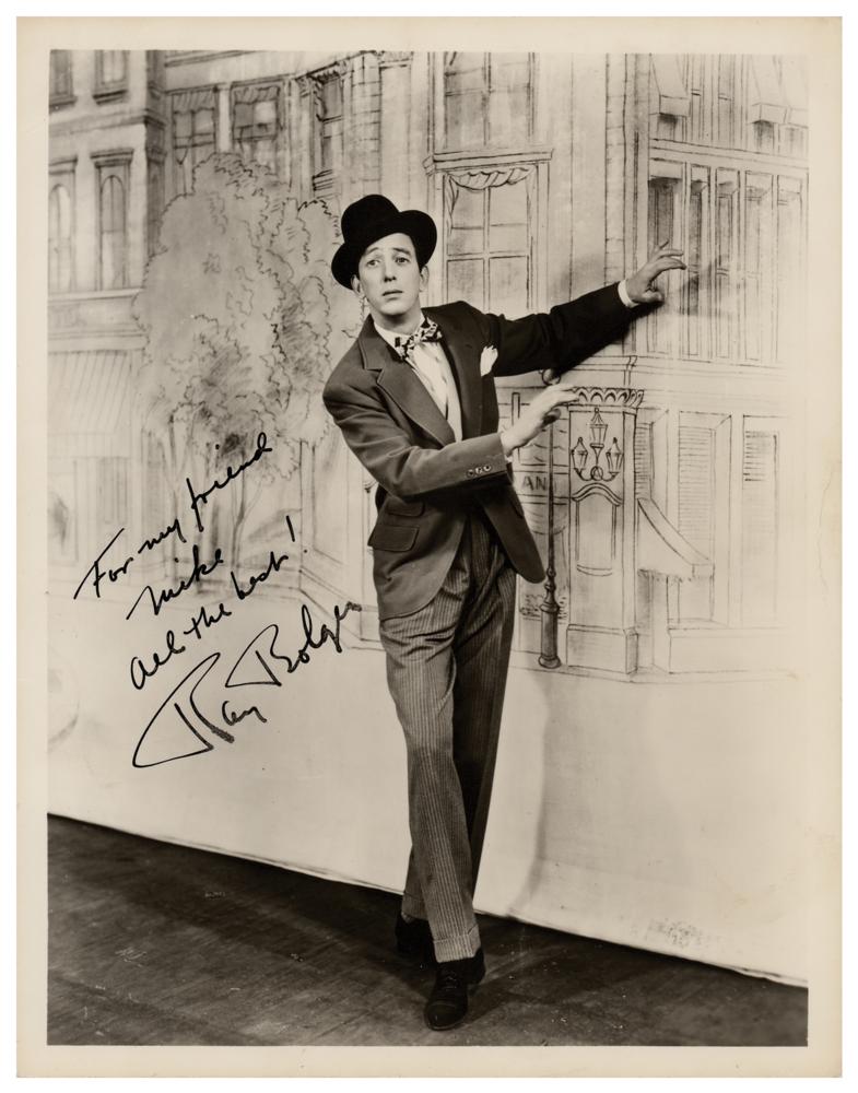 Vintage matte-finish 8 x 10 full-length photo of Bolger in a nice dancing pose, signed and inscribed in fountain pen, "For my friend Mike, All the best! Ray Bolger.” In fine condition, with a subtle vertical bend.