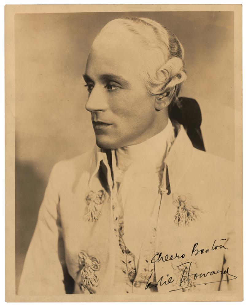 Vintage sepia matte-finish 8 x 10 photo of Howard in an elaborate old-fashioned costume, signed and inscribed in fountain pen, "Cheers Boston, Leslie Howard.” In very fine condition.