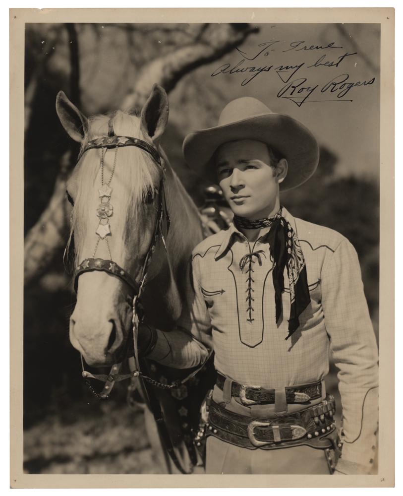 Vintage matte-finish 8 x 10 photo of Rogers decked out in Western gear beside his horse, signed and inscribed in fountain pen, "To Irene, Always my best, Roy Rogers.” In fine to very fine condition, with pin holes to the corners.