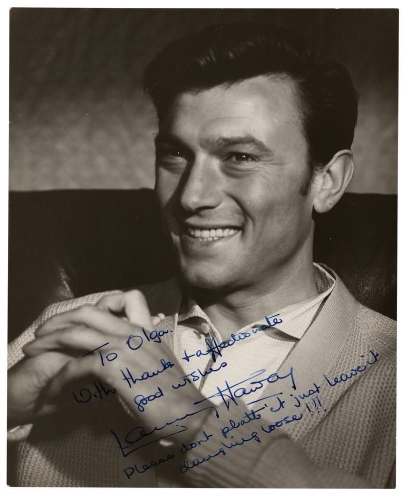 Actor (1928-1973) who established himself in British film through appearances in King Richard and the Crusaders and Romeo and Juliet. Vintage glossy 7.75 x 9.75 photo of Harvey smiling, neatly signed and inscribed in fountain pen, "To Olga, With thanks & affectionate good wishes, Laurence Harvey, Please don't platt it just leave it dangling loose!!!” In fine condition, with scattered small surface creases, and light surface impressions from a notation on the back.