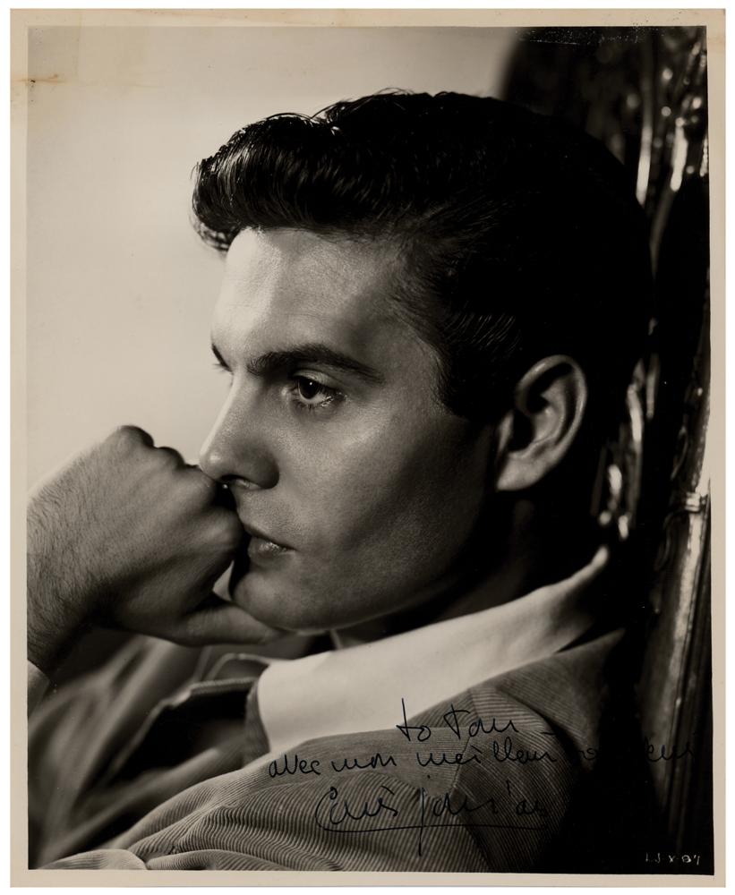 Handsome vintage glossy 8 x 10 close-up photo of Jourdan striking a pensive pose, signed and inscribed in fountain pen in French. In fine condition, with a stain to the upper left corner.