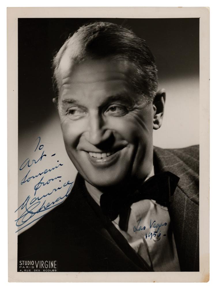 Vintage glossy 7 x 9.5 photo of the French entertainer by Studio Virgine of Paris, signed and inscribed in fountain pen, "To Art—Souvenir from Maurice Chevalier, Las Vegas 1956.” In very good to fine condition, with scattered light creasing.