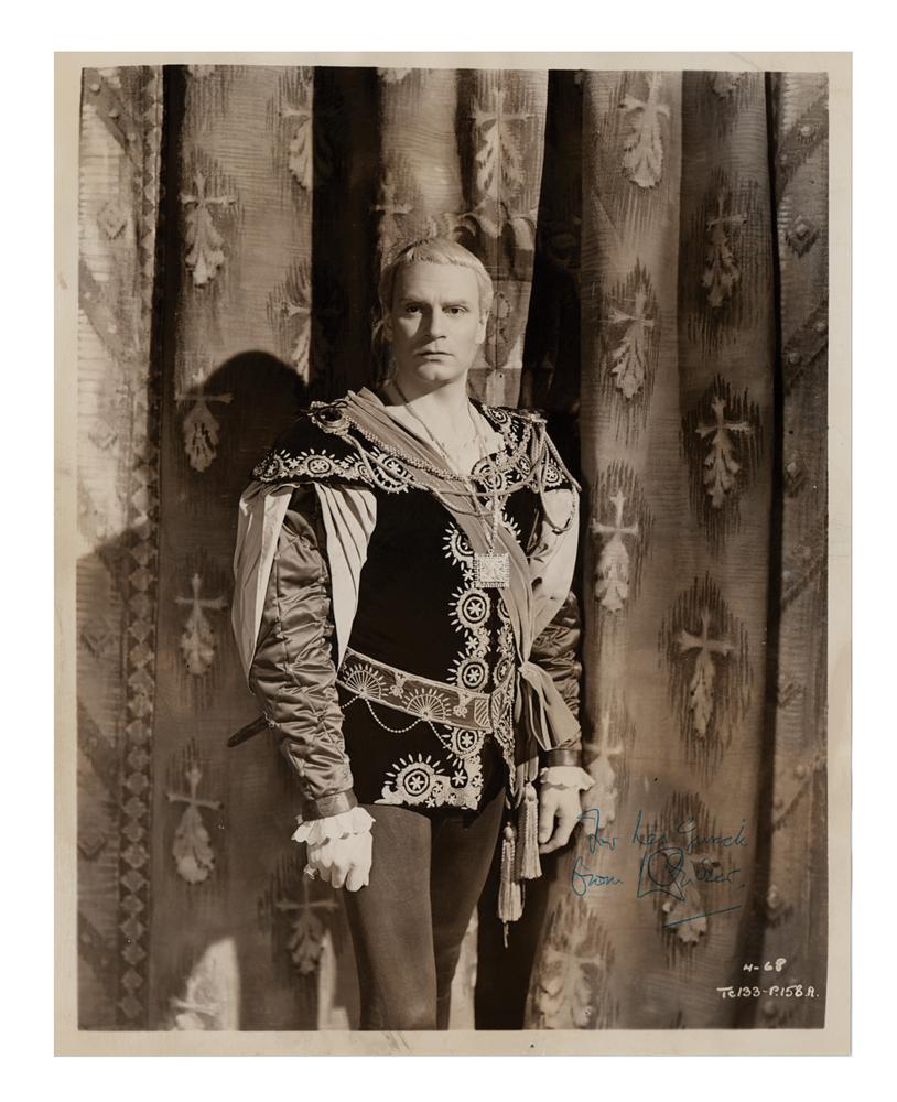 Vintage glossy 7.75 x 9.75 photo of the great actor in the classic Shakespearean role of Hamlet, signed and inscribed in blue ballpoint, "For Les Guzick, from L. Olivier.” In very good to fine condition, with rippling to the top edge, scattered light creasing, and surface rubbing.
