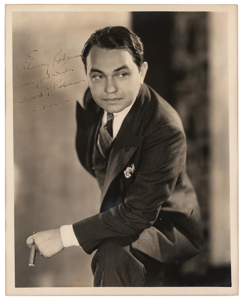 Vintage matte-finish 8 x 10 photo of Robinson posing with a cigar in hand, signed and inscribed in fountain pen, "To Johnny Rotaman, All good wishes, Edward G. Robinson, 2.18.32.” Blindstamped in the lower corner by photographer Elmer Fryer. In fine condition, with a small spot of silvering on his left sleeve, and some fading to the handwriting.