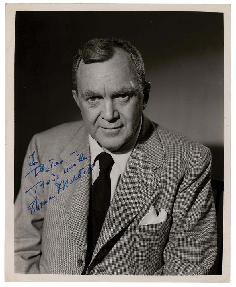 Actor (1892-1962) who portrayed Scarlett O'Hara's father in Gone with the Wind and Uncle Billy in It's a Wonderful Life. Uncommon vintage glossy 8 x 10 half-length portrait of Mitchell in a suit and tie, signed and inscribed in fountain pen, "To Peter—Best wishes, Thomas Mitchell.” In fine condition.