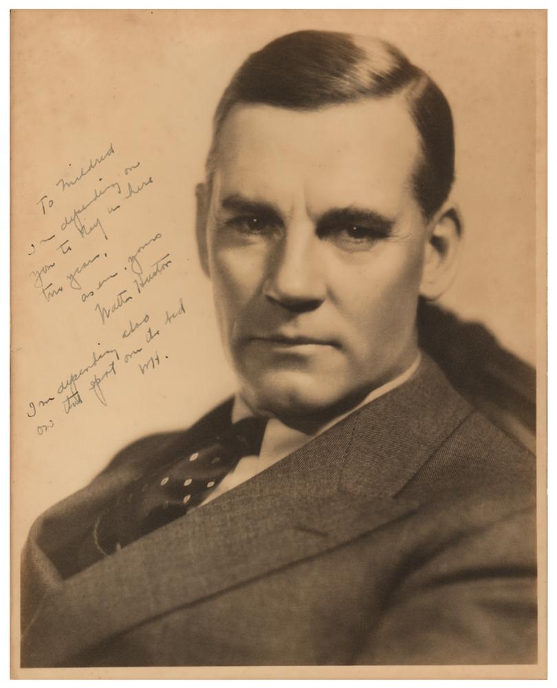 Vintage matte-finish 8 x 10 photo of Huston looking into the camera, signed and inscribed in fountain pen, “To Mildred, I’m depending on you?as ever yours, Walter Huston,” who adds below: “I’m depending also on the spot on the bed. MH.” Affixed to a same-size mount and in fine condition.