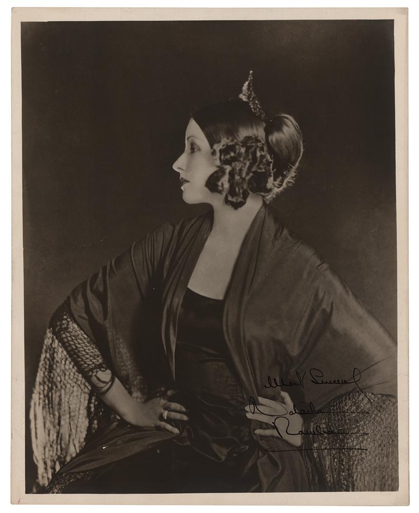 Ballerina, set designer, costume designer, and actress (1897-1966) who was the second wife of Rudolph Valentino. She exhibited such control over his films that Paramount barred her from her husband's sets; they divorced shortly afterward. Vintage matte-finish 8 x 10 photo of Natacha Rambova in an attractive half-length profile pose, signed neatly in fountain pen, “Most Sincerely, Natacha Rambova.” In fine condition, with two light creases to the left side. A scarce image of Valentino’s tempestuous spouse, who was bequeathed just one dollar in his will when he died in 1926.