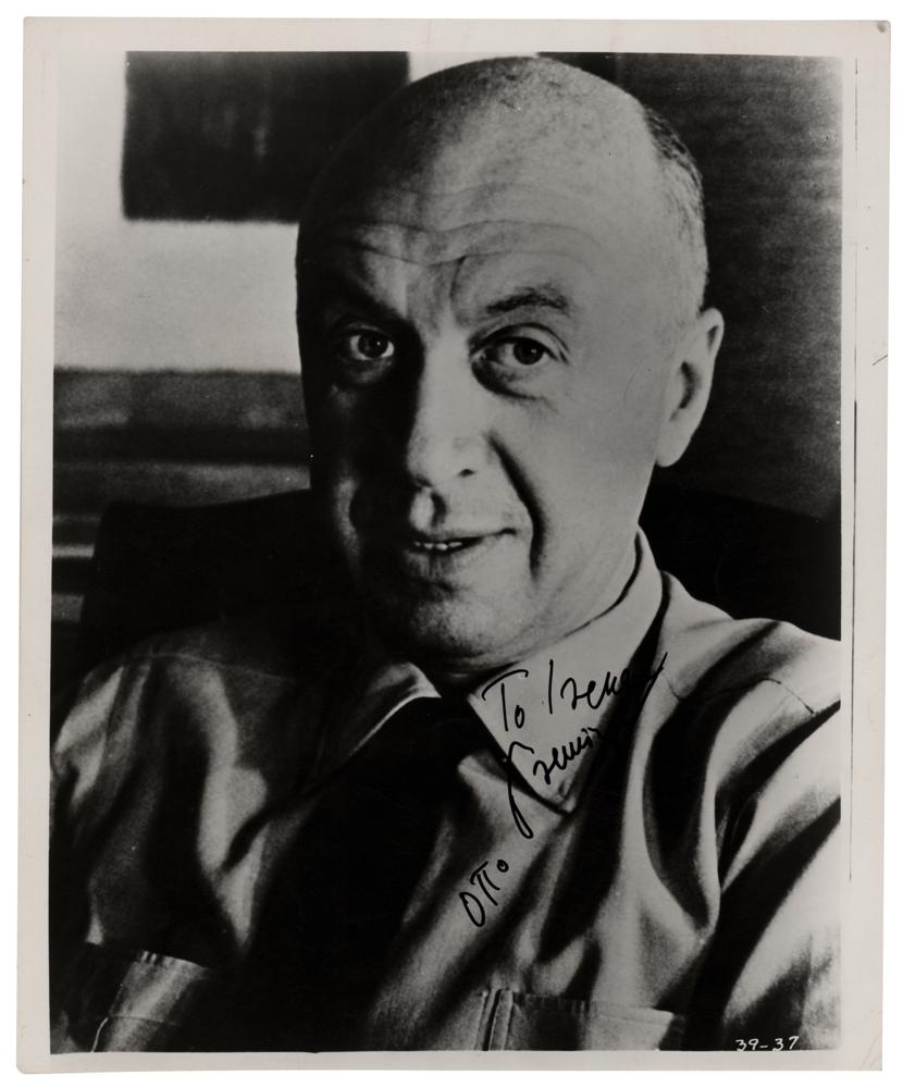 Glossy 8 x 9.75 photo of the influential Oscar-nominated director, signed and inscribed in black felt tip, "To Henry, Otto Preminger.” In fine condition, with scattered light creasing.