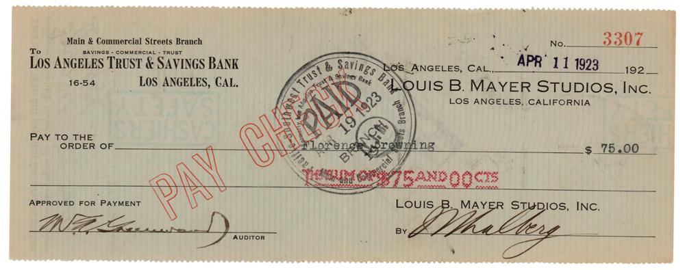 Louis B. Mayer Studios check, 8.5 x 3.25, filled out in type and signed by Irving Thalberg, "I. Thalberg," payable to Florence Browning for $75, April 11, 1923. In fine condition.