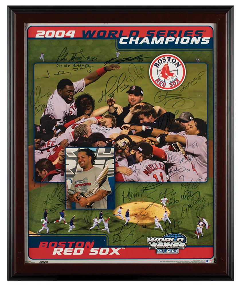 Color glossy 15.5 x 19.5 composite photo of the 2004 World Series champions, signed in black felt tip by more than 24 members of the Red Sox team, including: Pedro Martinez, David Ortiz, Manny Ramirez, Curt Schilling, Jason Varitek, Tim Wakefield, Johnny Damon, Kevin Youkilis, Bronson Arroyo, Keith Foulke, Bill Mueller, Ellis Burks, Doug Mirabelli, Dave Roberts, David McCarty, Curtis Leskanic, Pokey Reese, Doug Mientkiewicz, Orlando Cabrera, Mark Bellhorn, and others. Framed and in fine condition, with fading rubbing to a few of the signatures, and a ding to the upper left corner.