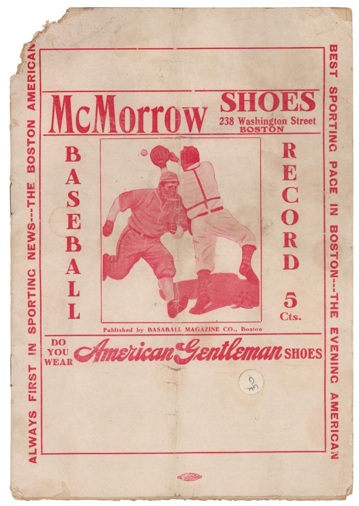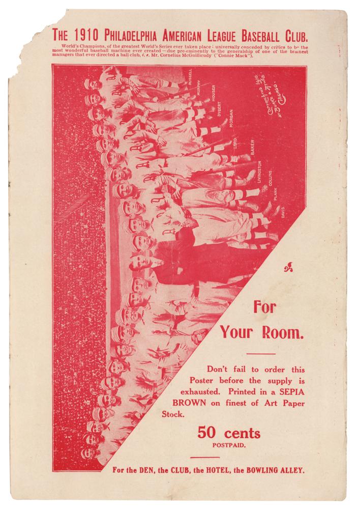 Scarce original "Baseball Record" program for a National League game between the Boston Rustlers and Brooklyn Trolley Dodgers, 20 pages, 6.75 x 9.75, with the scorecard listing notable players such as Hank Gowdy for Boston and Zack Wheat for Brooklyn. Inside the rear cover is an interesting ad for a poster of the 1910 World Series champion Philadelphia Athletics. In good to very good condition, with a central vertical fold, scattered soiling, and losses to the upper left corner.