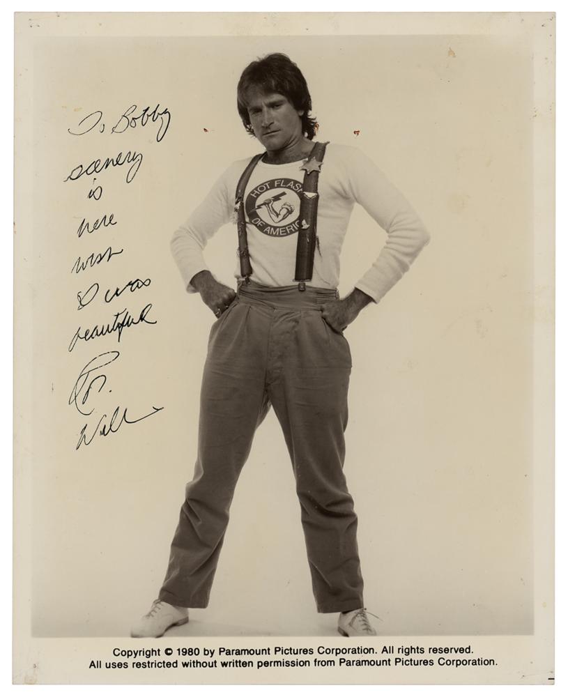 Super early glossy 8 x 10 Paramount Pictures publicity photo of the comedic legend in a full-length pose with suspenders and arms akimbo, signed and inscribed in black ink, "To Bobby, scenery is here, wish I was beautiful, Robin Williams.” In fine condition, with staple holes to the corners, and light overall crazing to the emulsion.