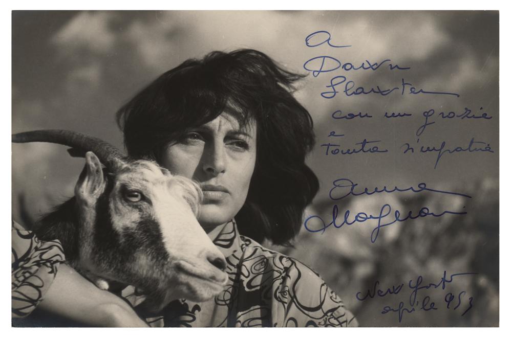 Italian stage and film actress (1908-1973) who won the Academy Award for Best Actress for her portrayal of a Sicilian widow in The Rose Tattoo. Vintage matte-finish 7 x 4.75 photo of Anna Magnani as Maddalena Natoli posing with a goat in the 1950 drama Volcano, signed and inscribed in Italian in fountain pen, "Anna Magnani, New York, Aprile 953.” In very fine condition.