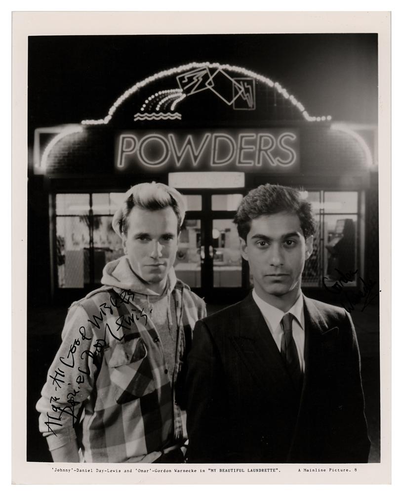 Glossy 8 x 10 Mainline Picture publicity photo for the 1985 film My Beautiful Laundrette, signed and inscribed in black felt tip, "Alan—All good wishes, Daniel Day-Lewis.” In fine condition.